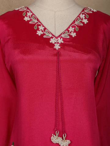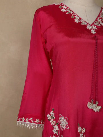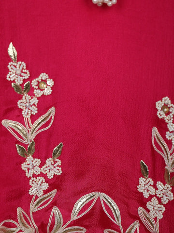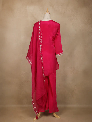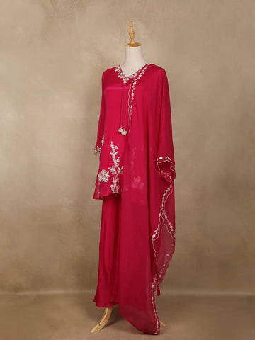 Make a stunning statement with this Pink Crepe Silk Sharara Suit, crafted to radiate elegance and festive charm. The vibrant pink shade brings a lively and graceful aura, while the smooth crepe silk fabric drapes beautifully, ensuring comfort along with luxury.