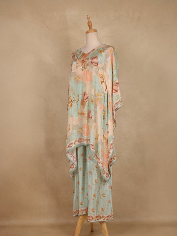 Sky Blue Floral Printed Design Crepe Kaftan Suit